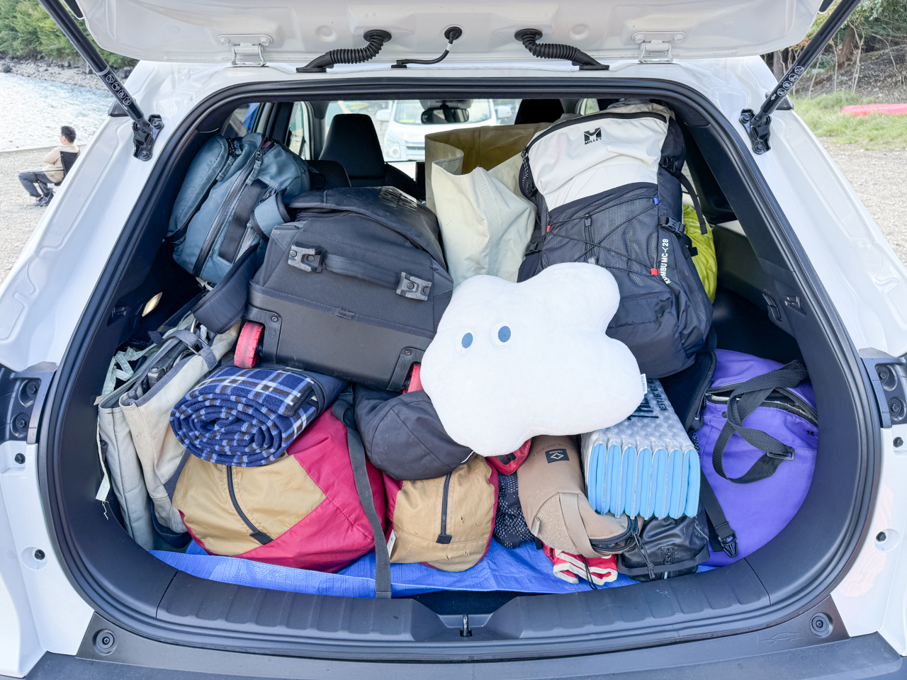 積載性:大人3人分のキャンプ道具を積んだ結果(後部座席の快適性も)