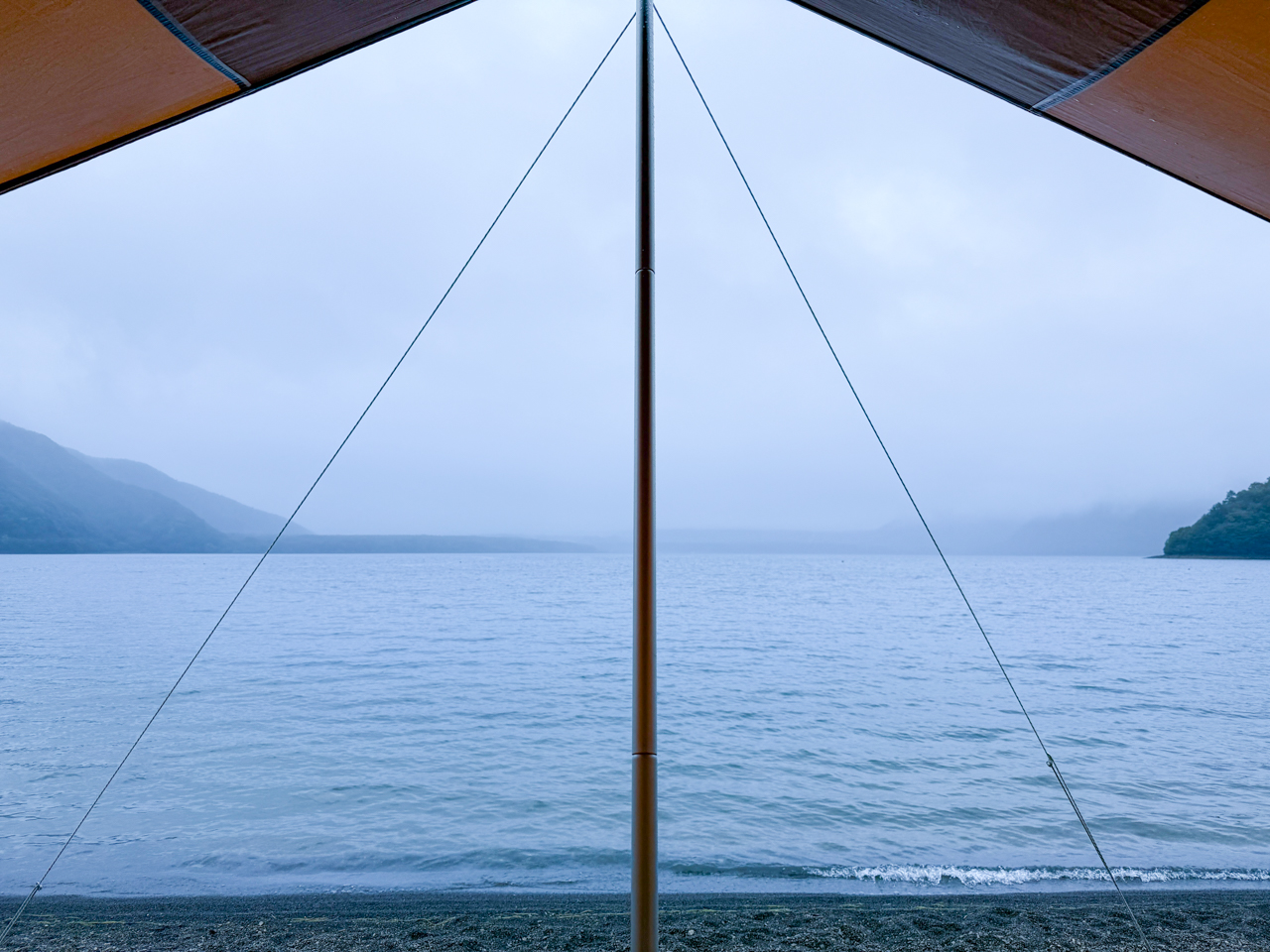 風で煽られる危険があるため必ず2人以上で行いましょう。私たちは3人がかりでやったのに、危うくタープが湖の藻屑と消えるところでした…。だいぶずぶ濡れですが、1時間ほどで撤収完了!