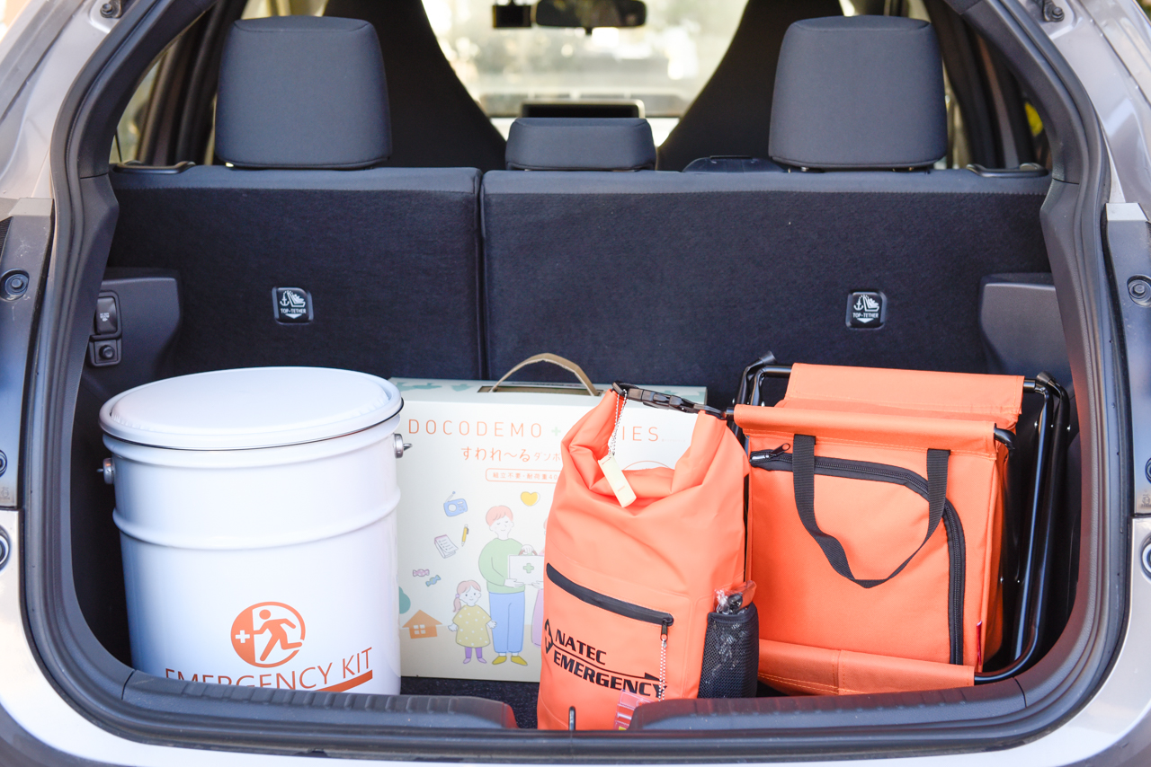 ヤリスの荷室にそれぞれの防災セットを載せてみました。